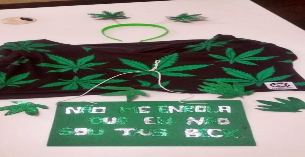 A fantasia tinha tiara, blusa e minissaia com folhas de maconha e uma placa com os dizeres: “Não me enrola que eu não sou teus beck”.