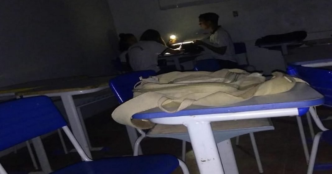 Em outra imagem, é possível ver que a fiação elétrica exposta divide espaço com o forro comprometido. Em outra, alunos são vistos usando a lanterna de um celular em meio a escuridão.