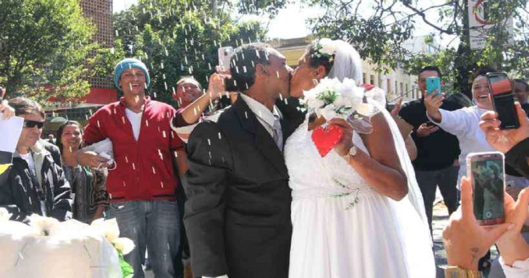 A cerimônia foi promovida pela equipe do Centro de Referência Especializado de Assistência Social. “Eles externaram o desejo de se casarem. Fizemos a cerimônia para mostrar que, mesmo na rua, é possível se amar, encontrar a cara metade e seguir à frente”, afirma a supervisora de serviço especializado em abordagem social, Fátima Gomes Pereira.