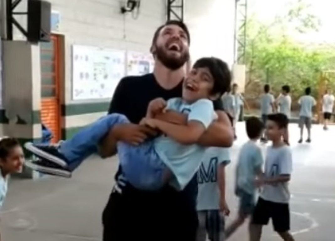 João Hoffmann é professor de educação física na escola Sítio I, onde Heitor, 7 anos, estuda. Na quinta-feira (31) ele conta que os alunos estavam em um período livre para brincadeiras quando Heitor viu um grupo pulando corda e pediu para pular junto com eles. Em resposta ao pedido, ele pegou o aluno no colo e pulou corda com ele.