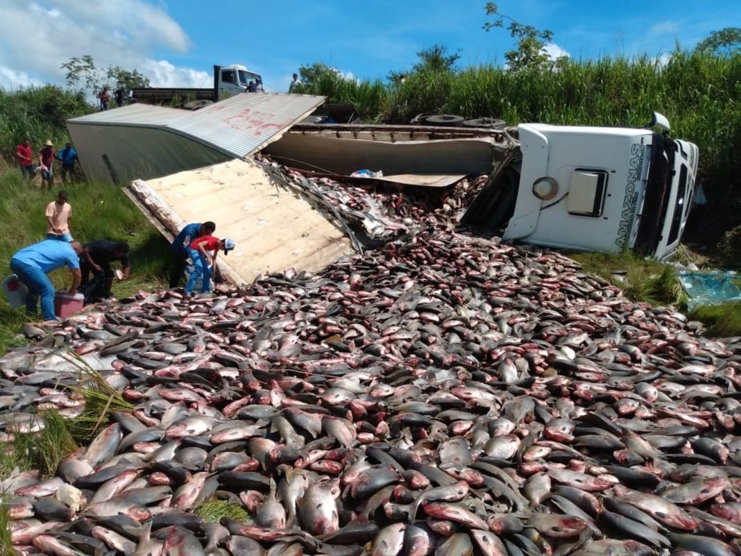 Com o tombamento, as cerca de 30 toneladas de peixes tambaqui foram espalhadas pelas margens da rodovia. Diversas pessoas estiveram no local desde o início da manhã com sacos para levar a carga.