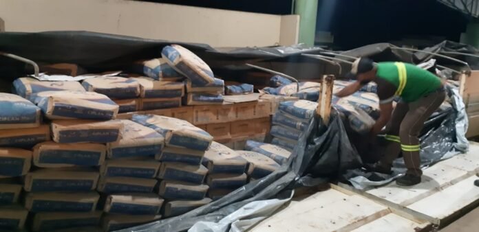 Ao fazer a inspeção no semirreboque, os policiais e fiscais encontraram várias caixas de cachaça nacional escondidas debaixo dos sacos de cimento.