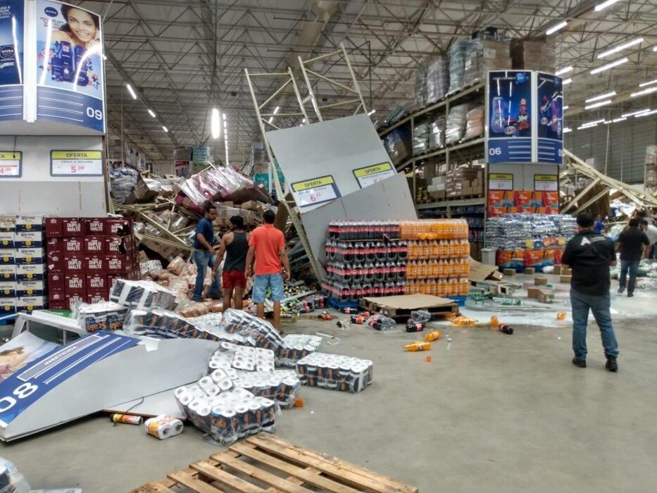 Vídeos mostram a queda de prateleiras em efeito dominó. Clientes foram resgatados debaixo de pilhas de produtos.