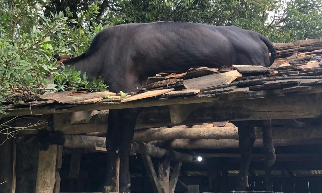 No último domingo (25), uma vaca subiu no teto de um rancho em Timbó, no Vale do Itajaí, em Santa Catarina. O animal ficou preso no telhado e foi resgatado pelo Corpo de Bombeiros.