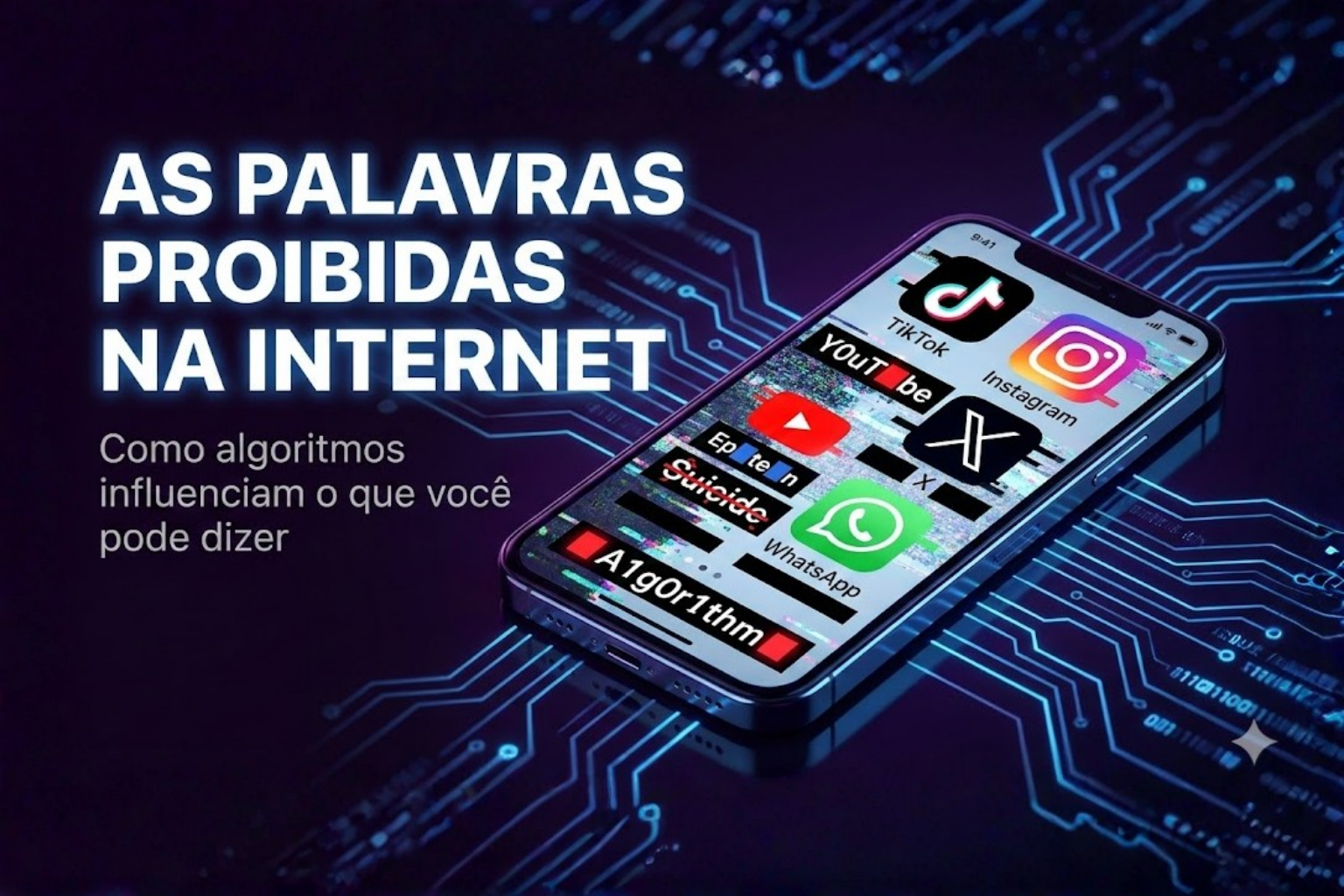 Smartphone com ícones de redes sociais censurados e título “As palavras proibidas na internet” sobre fundo tecnológico.