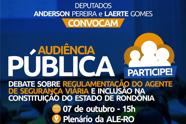 Proposta pelos deputados Anderson Pereira (Pros) e o presidente da Assembleia Legislativa, Laerte Gomes (PSDB), será realizada audiência pública com o objetivo de discutir sobre a proposta de regulamentação da profissão de agente de segurança viária, nas fileiras do Departamento Estadual de Trânsito Rondônia(Detran), tendo em vista a necessidade de profissionais para atenderem a demanda do Estado, bem como manter a ordem e o bom funcionamento das vias públicas.