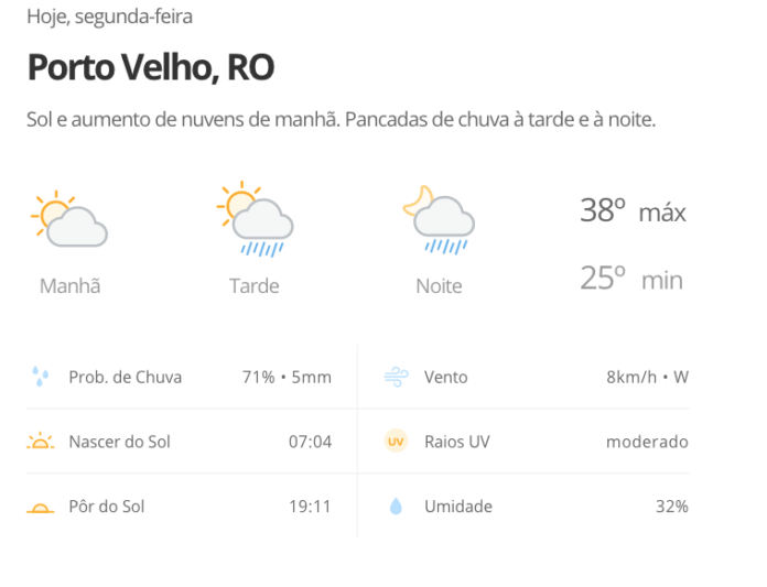 Porto Velho, RO | Sol e aumento de nuvens de manhã. Pancadas de chuva à tarde e à noite.