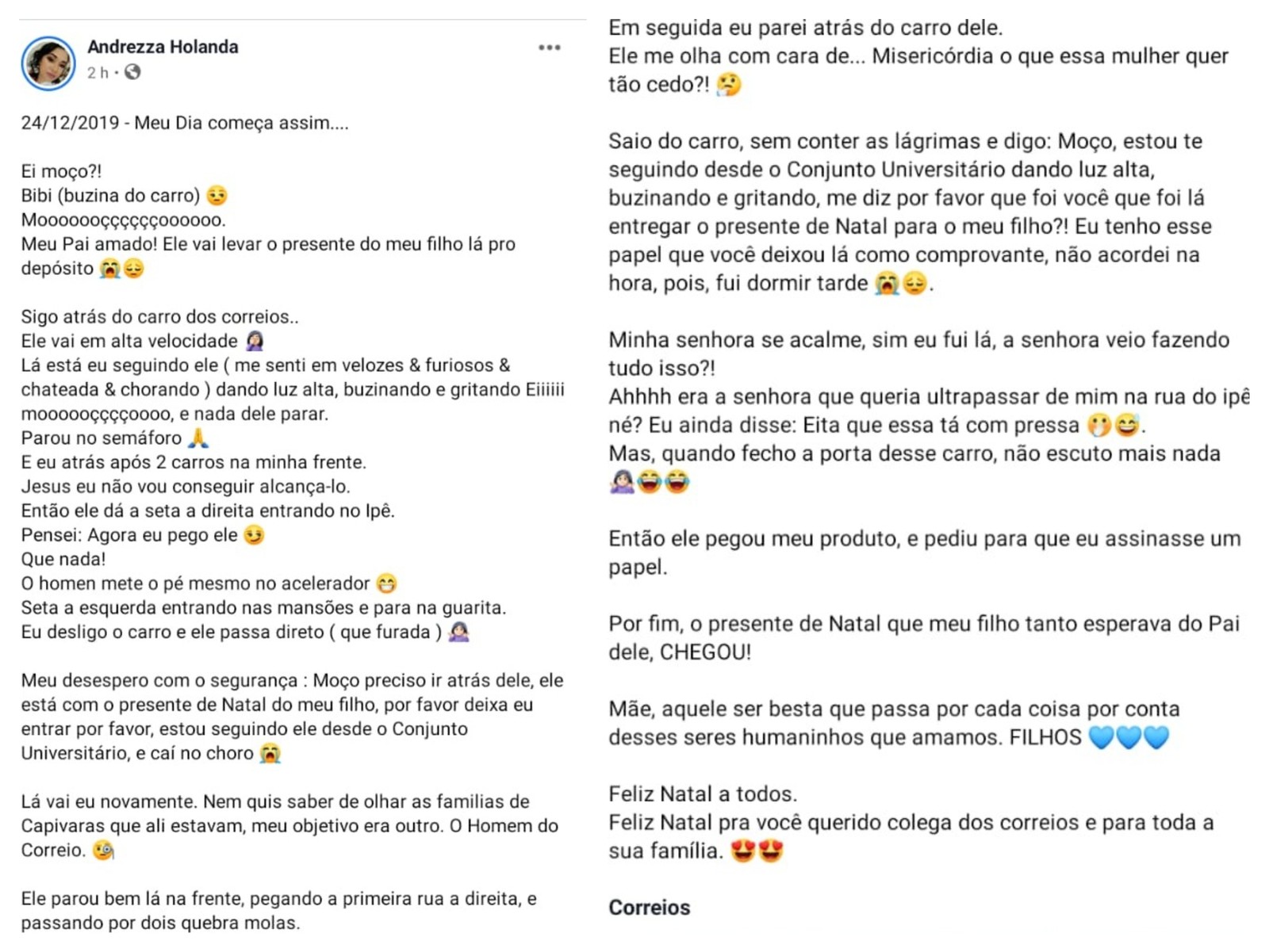 A história de Andrezza viralizou nas redes sociais em uma postagem que ela publicou. Ela contou todo percurso, o nervosismo, e o medo que ficou de não conseguir entregar o presente do filho no Natal.