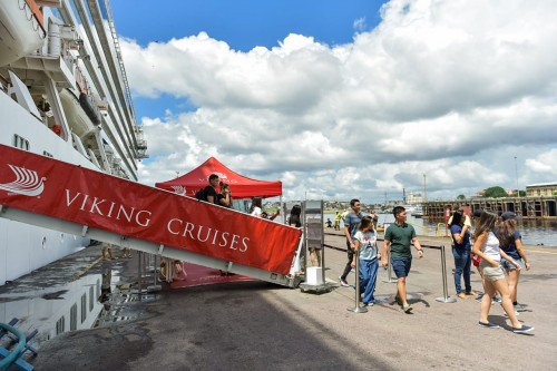 O quinto navio de cruzeiro da Temporada 2019/2020, o M/S Viking Sea, aportou em Manaus, nesta quarta-feira (31/12), com aproximadamente 1,4 mil turistas (grande maioria de norte-americanos e canadenses), entre cruzeiristas e tripulantes, que escolheram a capital para ver a chegada no Ano Novo. No Porto de Manaus, os excursionistas foram recebidos ao som dos sambas-enredos inesquecíveis executados pelos ritmistas da escola de samba Reino Unido da Liberdade.