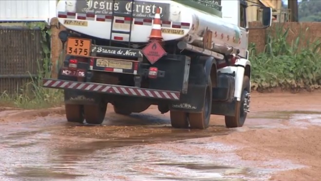 Com o período chuvoso, a poeira que é comum na via se transformou em lama. Os diversos buracos atrasam os trabalhos de quem transporta cargas na região e apresentam riscos para os moradores e motoristas.