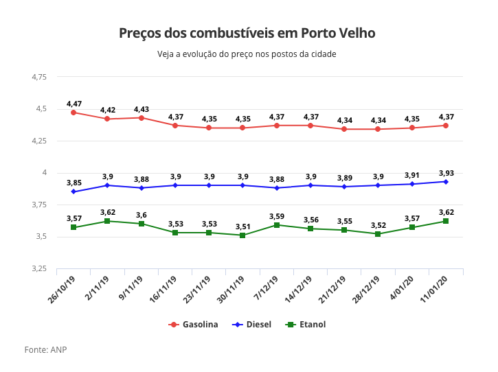 Os preços dos combustíveis subiram nos postos de Porto Velho. Uma pesquisa da Agência Nacional do Petróleo (ANP), divulgada no fim de semana, aponta que o valor médio da gasolina subiu 0,45% em uma semana, saindo de R$ 4,35 para R$ 4,37.