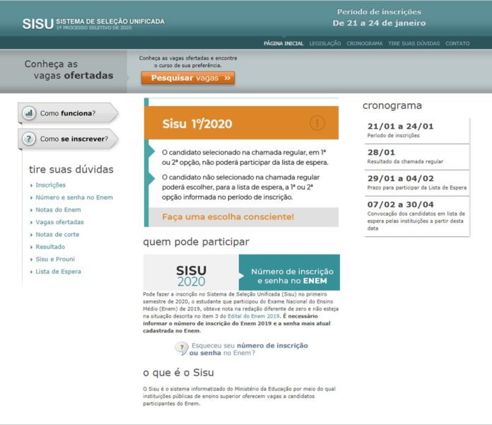 A inscrição é feita pela internet com a nota do Enem, que deve ser divulgada nesta sexta-feira (17), segundo o calendário do Instituto Nacional de Estudos e Pesquisas Educacionais (Inep), responsável pela prova.