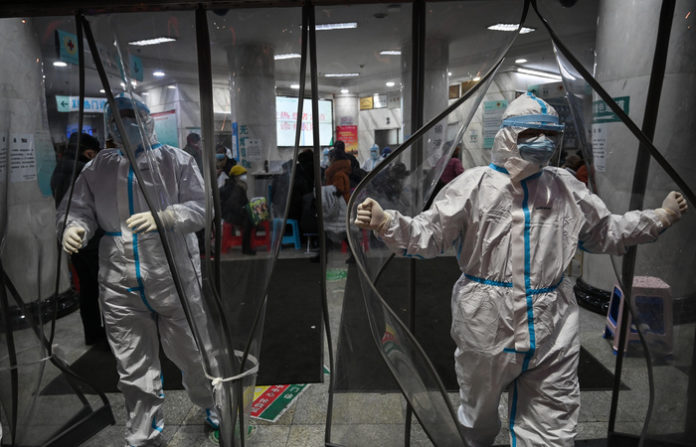 Medical staff members wearing protective clothing to help stop the spread of a deadly virus which began in the city, walk at the Wuhan Red Cross Hospital in Wuhan on January 25, 2020. - The Chinese army deployed medical specialists on January 25 to the epicentre of a spiralling viral outbreak that has killed 41 people and spread around the world, as millions spent their normally festive Lunar New Year holiday under lockdown. (Photo by Hector RETAMAL / AFP)