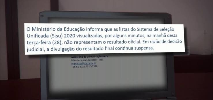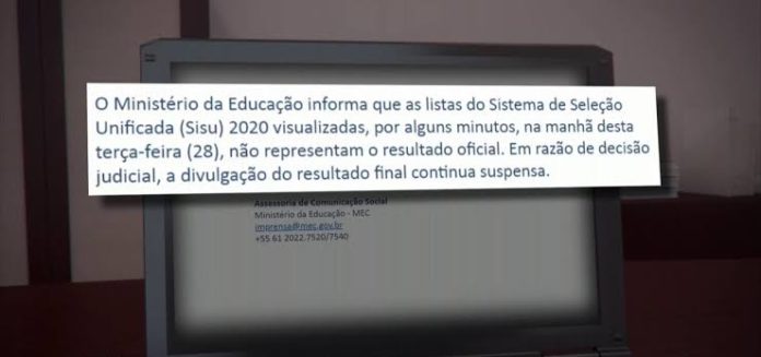 “O Ministério da Educação informa que as listas do Sistema de Seleção Unificada (Sisu) 2020 visualizadas, por alguns minutos, na manhã desta terça-feira (28), não representam o resultado oficial. Em razão de decisão judicial, a divulgação do resultado final continua suspensa” – nota do MEC