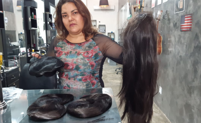 Com uso de medicamentos fortes, os cabelos de Duda Souza começaram a cair e ela não tinha condições de comprar uma peruca. “Por conta das minhas condições financeiras, eu passei parte do tratamento careca. Curada da doença, hoje eu tenho como doar uma peruca para quem está precisando, assim como eu precisei um dia”, disse a empresária.
