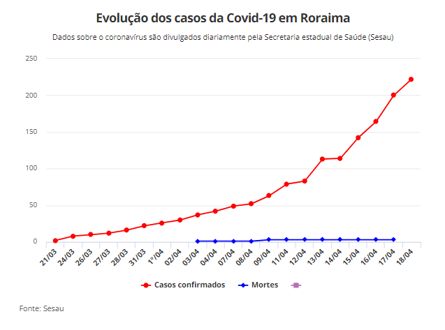 Roraima chegou a 222 casos confirmados de coronavírus, conforme nova atualização da Secretaria estadual de Saúde (Sesau) divulgada na noite desse sábado (18). O boletim epidemiológico registrou 21 novos casos da Covid-19.