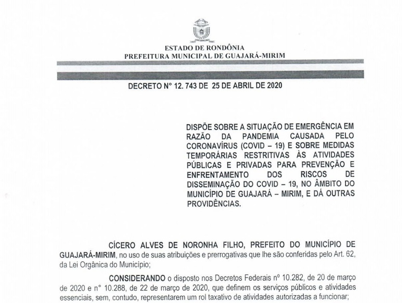 A Prefeitura de Guajará-Mirim (RO) publicou o decreto nº 12.743 com medidas de prevenção ao novo coronavírus. A ordem municipal entrou em vigor no último fim de semana. Com a reabertura das lojas, comerciantes devem preencher um termo de responsabilidade sanitária, onde assumem que cumprirão com as determinações de saúde previstas no documento.
