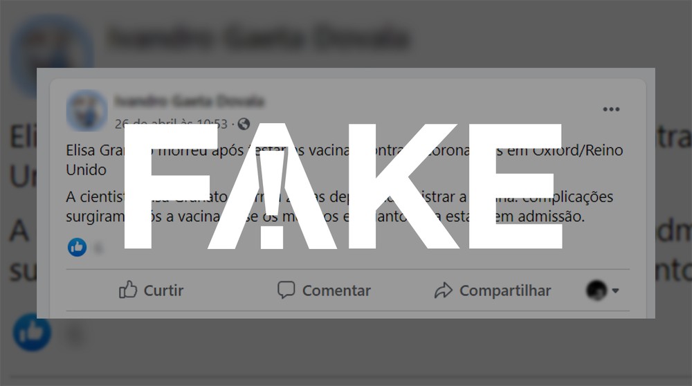 O texto falso afirma que Elisa, que teve a aplicação da vacina registrada em foto, também divulgada, morreu de complicações provocadas pela substância. O próprio governo britânico teve de desmentir o conteúdo, fato noticiado pelo jornal “The Guardian”.