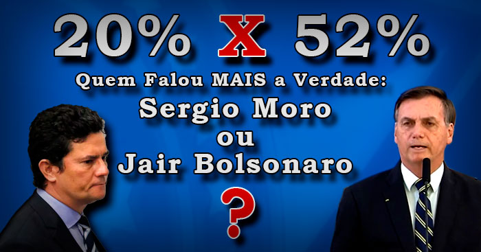 Quem falou mais a verdade: Sergio Moro ou Jair Bolsonaro? Uma pesquisa do instituto Datafolha, publicada na segunda-feira (27) pelo site do jornal “Folha de S.Paulo”, fez essa pergunta sobre a troca de acusações ocorrida na última sexta-feira (24), quando o ex-juiz da Lava Jato se demitiu do Ministério da Justiça.