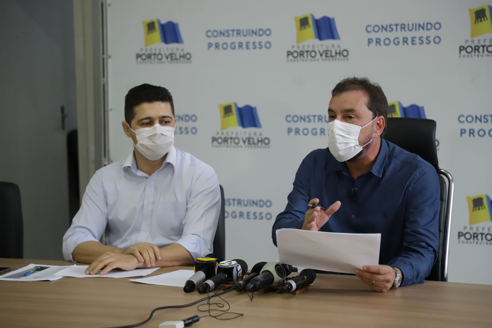 O prefeito de Porto Velho, Hildon Chaves, acompanhado do secretário Basílio Leandro, da Secretaria Geral de Governo (SGG), explicou em coletiva de imprensa na manhã desta quarta-feira (29), no Prédio do Relógio, sobre a suspensão do decreto 16.629, alterado pelo decreto 16.633/2020 que permitia a abertura gradual do comércio da capital.