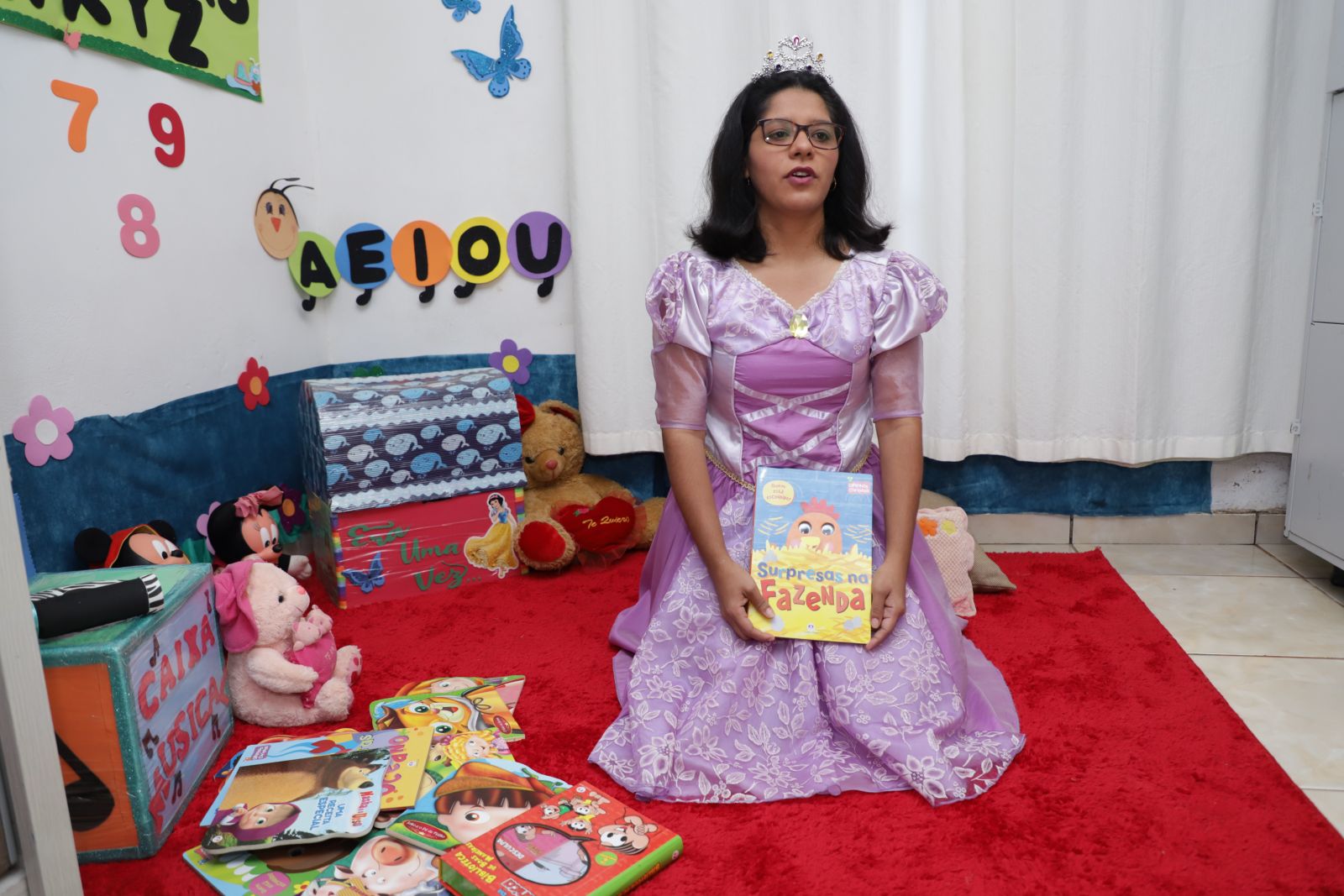 Segundo ela, era o que precisava ouvir. Daí em diante resolveu montar um cantinho que pudesse lembrar uma sala de aula da Educação Infantil. A professora dividiu o próprio quarto para montar um singelo cenário que conta com um baú de livros, caixa musical, as vogais, parabéns, os números, o alfabeto e decorou a porta do quarto para simular a porta da sala de aula.