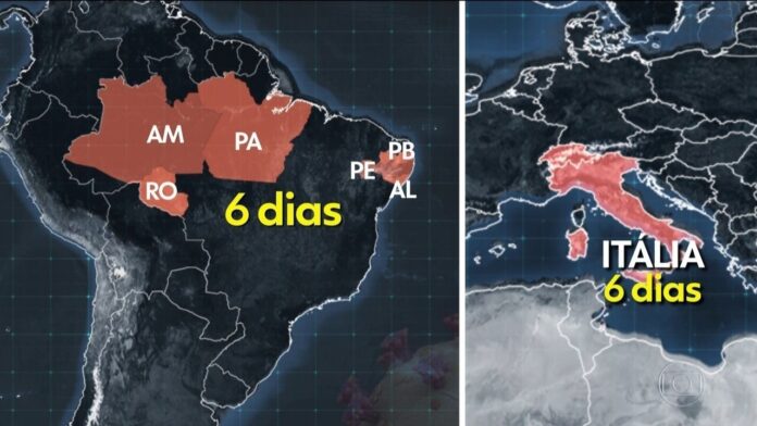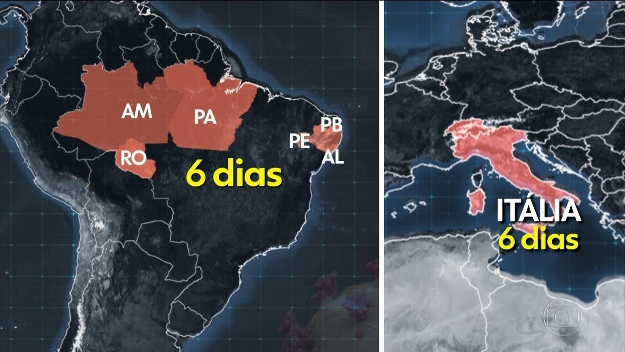 No Brasil, os casos dobram em menos tempos que Itália, Espanha e Reino Unido. Entre os estados brasileiros, o Maranhão é o que registra a mesma velocidade de óbitos que os Estados Unidos. Em outros estados como Amazonas, Rondônia, Pará, Paraíba, Pernambuco e Alagoas, o registro de novos casos equivale ao da Itália.