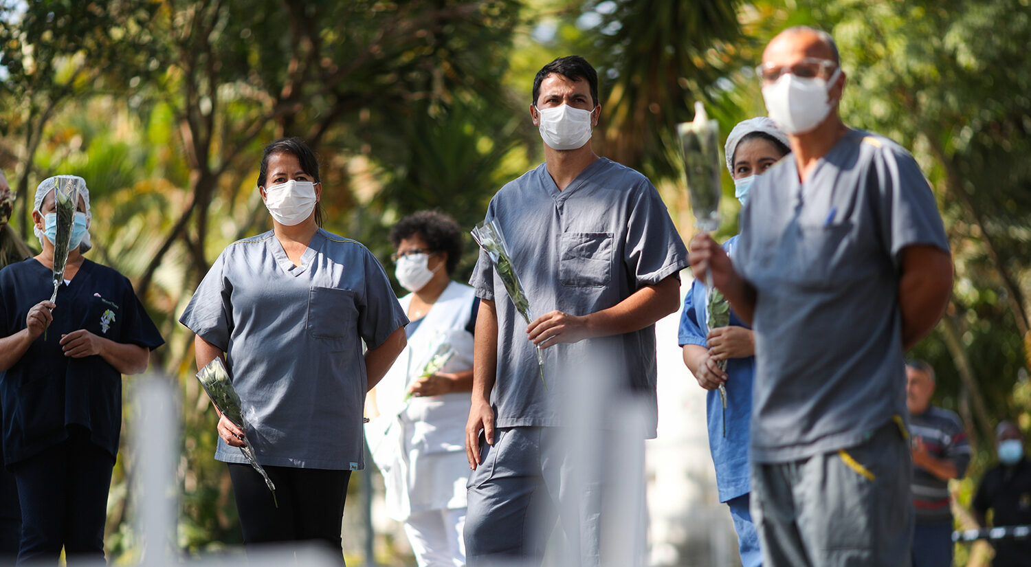 Health workers wearing protective face masks hold flowers in front of crosses as they pay a tribute for their co-worker Maria dos Santos, a nurse, who died of the coronavirus disease, amid COVID-19 outbreak, outside the Dr. Jose Soares Hungria Hospital in Sao Paulo, Brazil, April 23, 2020. REUTERS/Amanda Perobelli