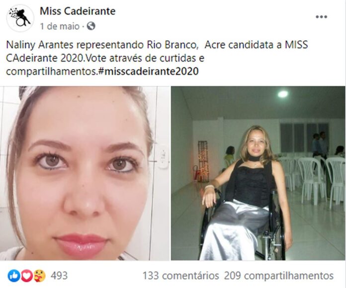 “Eu nunca imaginei estar na semifinal de um concurso nacional de beleza”, afirma a acrena Naliny Arantes, de 32 anos, que participa do concurso nacional de miss cadeirante e é uma das semifinalistas da competição.