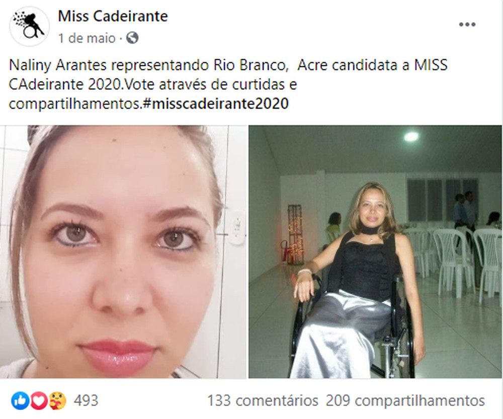 E a Naliny está entre as candidatas que avançaram para a próxima etapa. A final do concurso está prevista para o dia 30 de junho. Na página da votação, ela tem quase 500 curtidas e mais de 200 compartilhamentos.