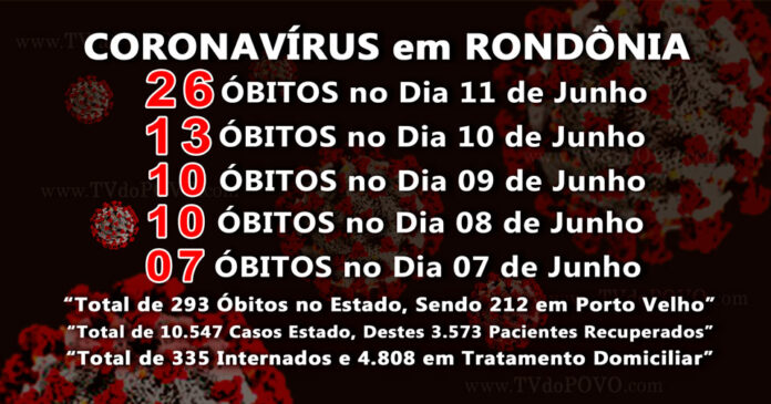 Hoje (11) foram confirmados 26 óbitos por Covid-19 em Rondônia, 19 em Porto Velho, sendo um recém nascido do sexo feminino, seis mulheres (28, 36, 39, 47, 73 e 75 anos), 12 homens (33, 36, 37, 48, 59, 61, 65, 67, 68, 69 e dois de 74 anos de idade); um homem de 52 anos de Vilhena; um homem de 71 anos de Ariquemes, uma mulher de 28 anos de Presidente Médici, um homem de 47 anos de Ouro Preto do Oeste, um homem de 56 anos de Machadinho do Oeste, uma mulher de 84 anos de São Miguel do Guaporé e um homem de 64 anos de Candeias do Jamari.