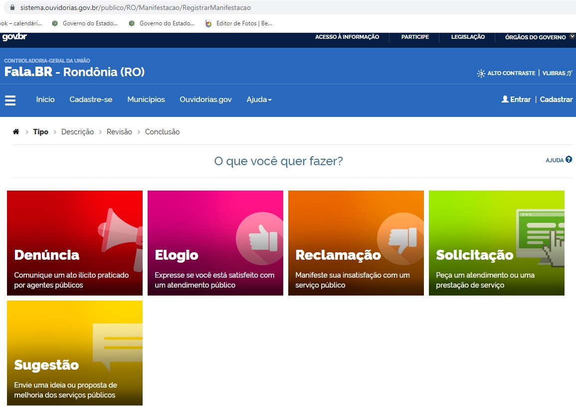 Nos canais de atendimento os usuários podem fazer as seguintes manifestações: denúncias, solicitações, reclamações, elogios, sugestões e comunicação.