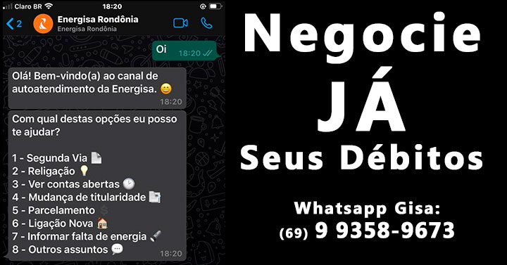 Para negociar os débitos com a Energisa basta entrar em contato com a distribuidora pelo Whatsapp da Gisa ou pelo Call Center. Pelo Whatsapp, é só escrever “Parcelamento” e a negociação será iniciada.