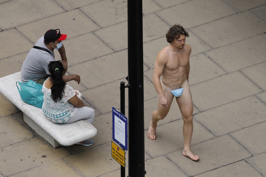 Homem vestido apenas com máscara passeia por Londres