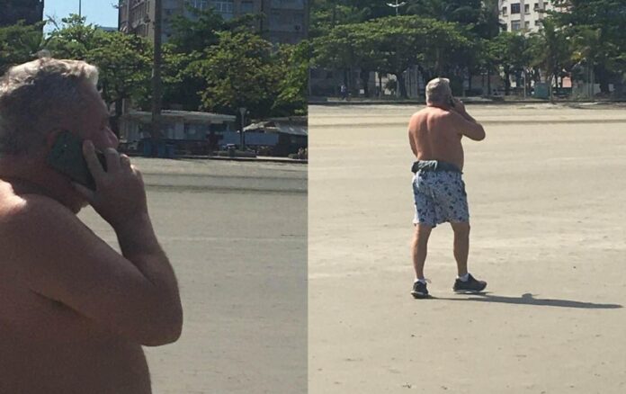 O registro foi feito na manhã desta quarta-feira (5), segundo a moradora, que prefere não se identificar. Ela relata que o desembargador estava caminhando pela faixa de areia, com a máscara no pescoço, enquanto falava ao celular, do Canal 4 até o Canal 5. A cena durou cerca de 20 minutos. “Passou a Rua General Rondon, avistou uma viatura da GCM, deu meia volta e colocou a máscara”, descreve.