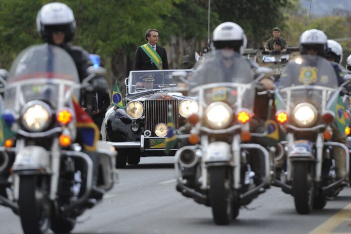O presidente Jair Bolsonaro desfila em carro aberto no incio do desfile de 07 de setembro
