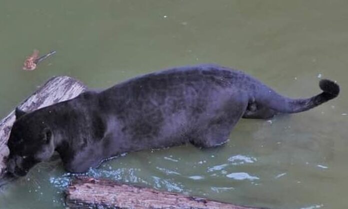 Uma onça-preta foi flagrada tomando banho no encontro dos rios Candeias e Jamari, zona rural da região de Porto Velho, durante o último fim de semana. A Panthera onca de cor preta é considerada rara na natureza.
