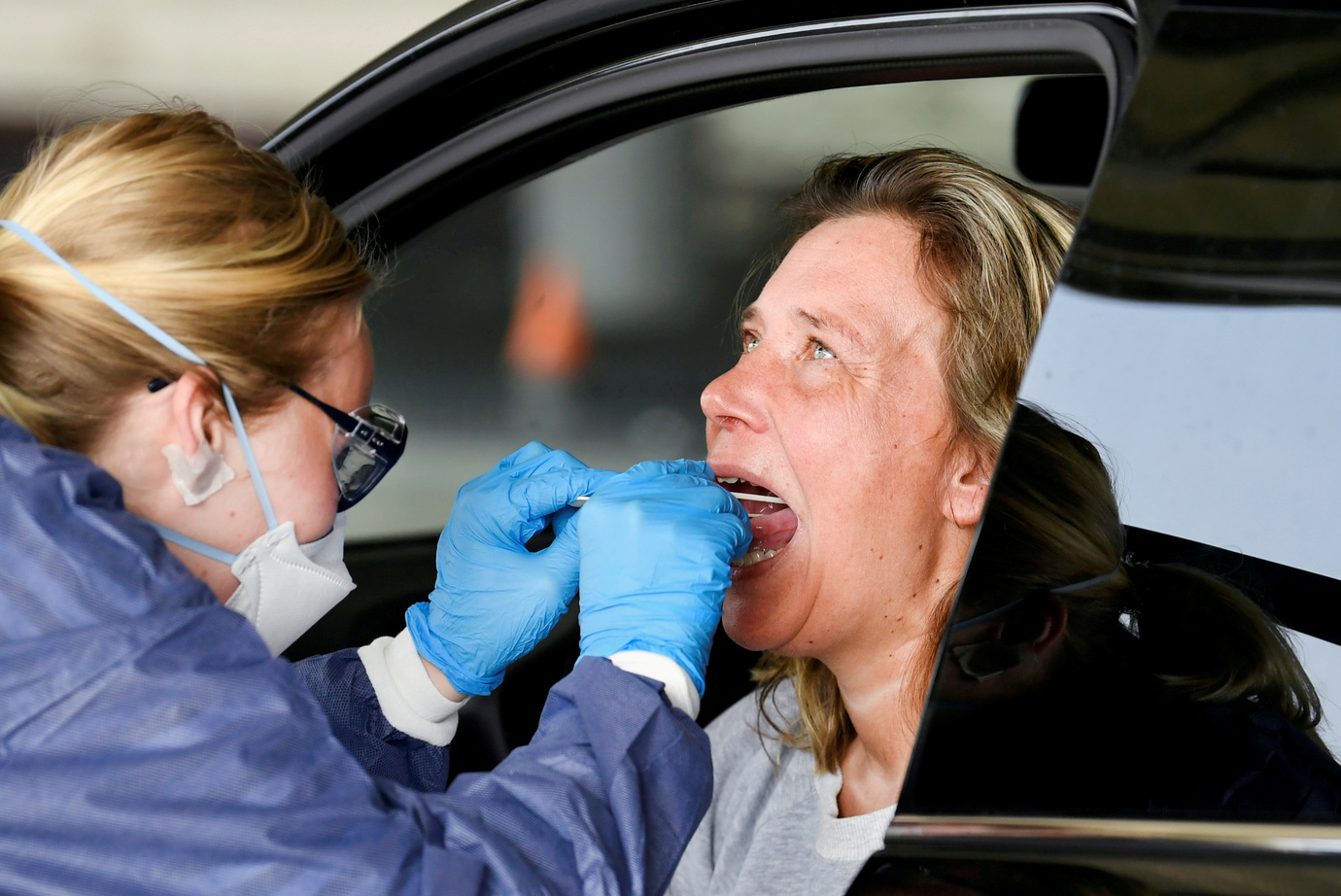 FILE PHOTO: A member of medical staff takes coronavirus test samples of a woman during drive-thru coronavirus disease (COVID-19) testing, on a converted ice rink, in Alkmaar, Netherlands April 8, 2020. REUTERS/Piroschka van de Wouw/File Photo