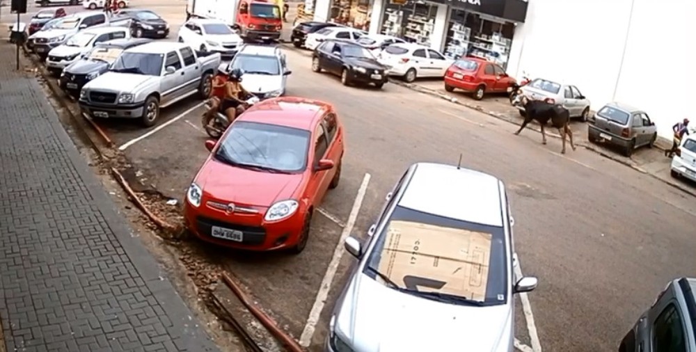 Câmeras de seguranças de uma rua da cidade flagraram o momento em que a búfala seguiu em direção à Avenida Sete de Setembro. Nas imagens, é possível ver quando um homem corre para se proteger e uma motocicleta sai com pressa do local.
