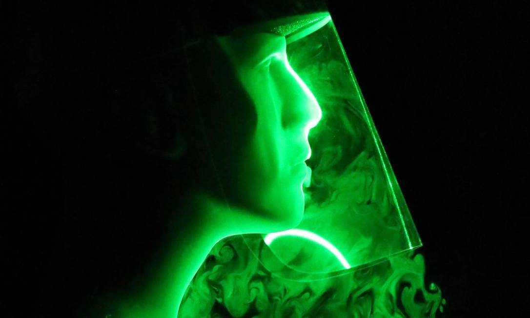 Visão de campo próximo da propagação da gota quando um protetor facial é usado para impedir o jato expelido — Foto: Siddhartha Verma, Manhar Dhanak, John Frankenfield/Divulgação