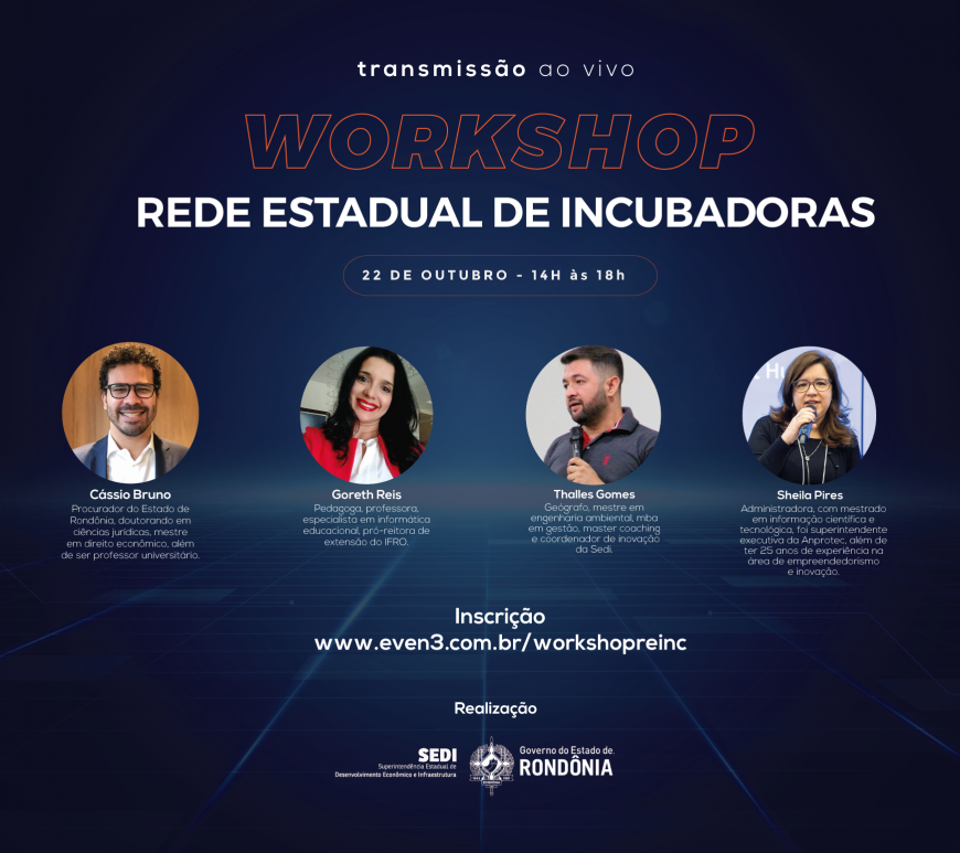 O Governo do Estado de Rondônia, por meio da Superintendência de Desenvolvimento Econômico e Infraestrutura (Sedi), promove na próxima quinta-feira (22), o I Workshop Rede Estadual de Incubadoras e Ambientes de Inovação (REINC).