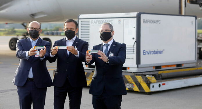 Na manhã desta quinta-feira, 3, chegou no Aeroporto Internacional de Guarulhos, em São Paulo, uma novo lote com insumos para produção da vacina CoronaVac. O imunizante contra o novo coronavírus é produzido em parceria pelo laboratório chinês Sinovac e o Instituto Butantan.