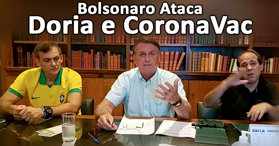 No começo da live, o presidente fez críticas à CoronaVac e questionou sua eficácia – ainda não divulgada oficialmente. “Parece que a eficácia da vacina de São Paulo está lá embaixo. Não vou divulgar percentual aqui, porque se eu errar 0,001%, eu vou apanhar da imprensa. Mas parece que a eficácia está lá embaixo, em relação à outra [vacina].”