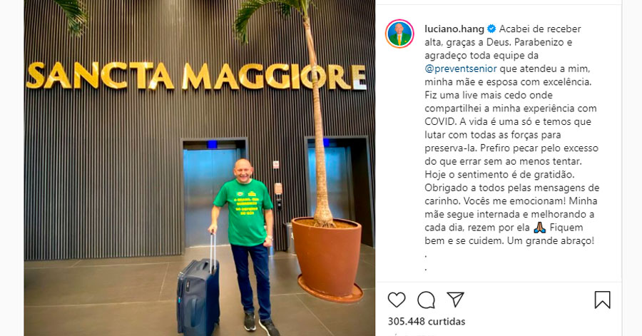 Em uma publicação nas redes sociais, o empresário bolsonarista agradeceu à equipe médica que o atendeu. Além dele, sua mulher, Andrea Hang, e sua mãe, Regina Modesti Hang, também foram internadas com Covid. Regina ainda segue no hospital.