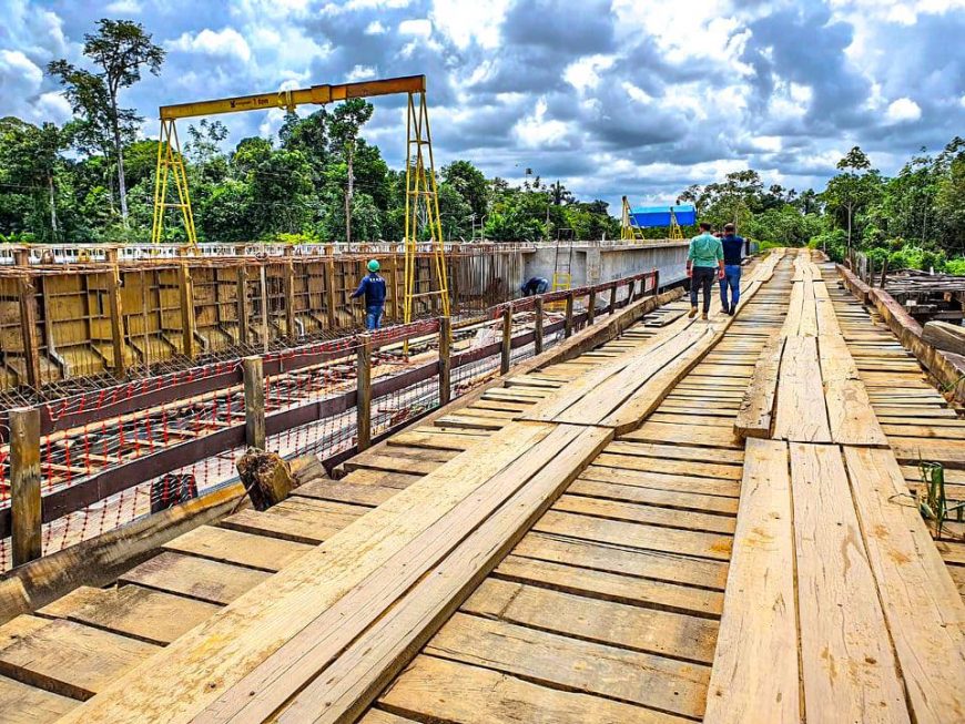 Com 100 metros de extensão e 8,80 metros de largura, a ponte terá pista dupla e está recebendo um investimento do Poder Executivo que ultrapassa R$ 4 milhões. De acordo com o diretor-geral do DER, Elias Rezende, a execução dos trabalhos segue em ritmo acelerado durante o inverno amazônico. Elias Rezende esteve no local acompanhado do coordenador de Operações e Fiscalização, Adeilson da Silva, para constar a evolução da obra. “A entrega da ponte sobre o rio Jacy-Paraná representa um grande avanço na infraestrutura desta região, garantindo a integração socioeconômica da região de Jacinópolis, Buritis, Nova Dimensão, Nova Mamoré e demais distritos e cidades do Vale do Jamary. Esta é mais uma obra prioritária que o governador determinou que seja finalizada com qualidade, reafirmando mais uma vez, seu compromisso com a população e com o desenvolvimento do nosso Estado”, informa.
