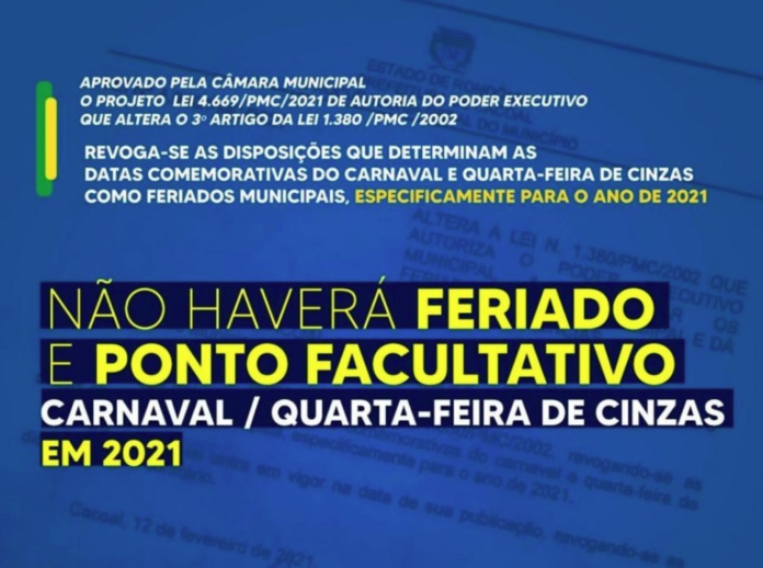 Em Cacoal não será diferente, o Projeto de Lei de nº 4.669/PMD/2021, de autoria do Executivo Municipal, alterando o Artigo 3º da Lei Municipal 1.380/PMC/202, cancelando o feriado de carnaval BM como a quarta feira de cinzas, especificamente para o ano de 2021, foi aprovada na sessão de sexta feira, dia 12 de fevereiro, já transformado em lei e publicado oficialmente.