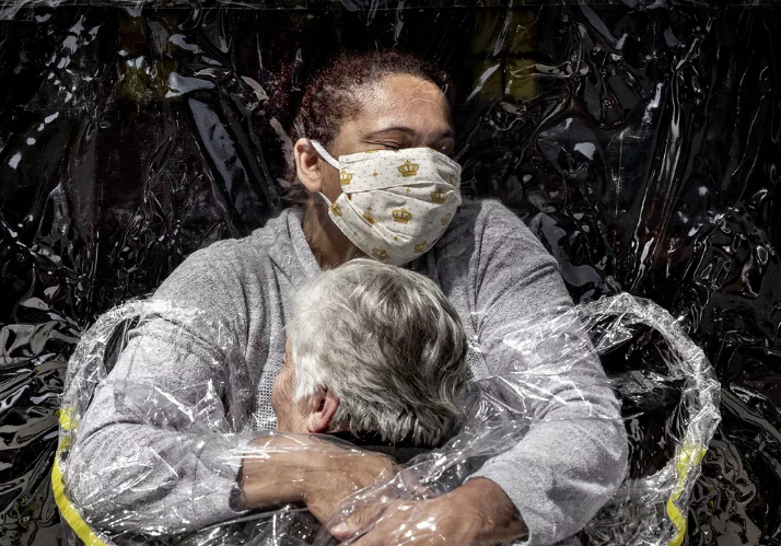 O fotógrafo dinamarquês Mads Nissen capturou o momento em que Rosa Luzia Lunardi foi abraçada pela enfermeira Adriana Silva da Costa Souza, com a proteção de um plástico por conta do coronavírus, na casa de repouso Viva Bem, na Zona Oeste de São Paulo, no dia 5 de agosto de 2020.