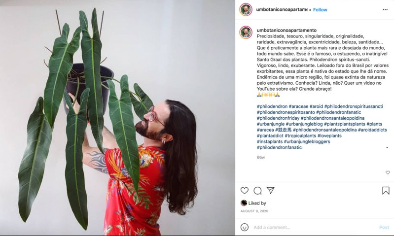 Isso porque muitos deles não estariam realmente interessados nas características das plantas, mas sim em ter espécies que os outros não tenham. “Hoje exibir uma planta rara nas redes sociais significa ganhar mais likes e seguidores, e isso tudo se traduz em mais dinheiro e mais patrocinadores. Virou um grande negócio”, afirma.