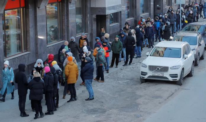 Nas maiores cidades russas, longas filas têm se formado na porta dos bancos, onde a população busca sacar recursos diante da crise financeira que se forma. As retiradas significativas fragilizam o sistema bancário, que pode ficar sem fluxo de caixa – e correr o risco de quebrar.