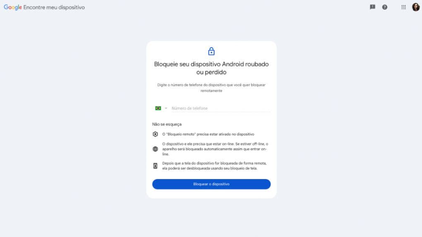 Por fim, o bloqueio remoto é um recurso disponível no link: android.com/lock. Ao acessá-lo (a partir de qualquer dispositivo com acesso à internet) e colocar o número do seu celular, o usuário consegue bloquear a tela do aparelho.