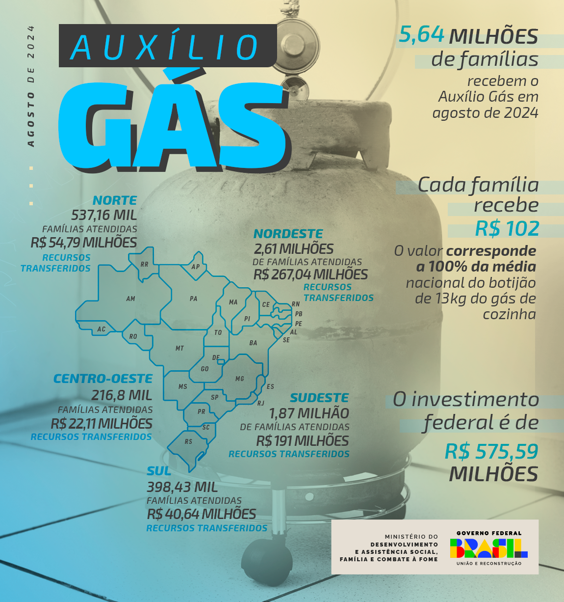 O Programa Auxílio Gás dos Brasileiros (PAGB) começa a ser pago nesta segunda-feira (19/8). Em agosto, mais de 5,64 milhões de famílias vão receber o benefício de R$ 102, criado para mitigar o impacto do preço do gás de cozinha no orçamento doméstico. Ao todo, o investimento do Ministério do Desenvolvimento e Assistência Social, Família e Combate à Fome (MDS) é de R$ 575,59 milhões.